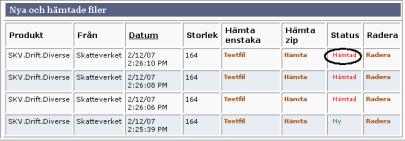 I kolumnen Status visas om filen är ny eller om den redan har hämtats. Filer sparas i tre dagar efter att de har hämtats ut. Det gör det möjligt att hämta filer flera gånger om något skulle gå fel i överföring eller när filen sparas. Den tidpunkt då filen har tagits emot av Skatteverkets mottagningstjänst visas i kolumnen Datum.