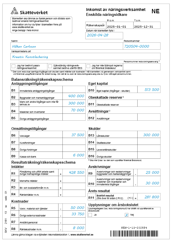 Här finns ett exempel som visar hur Håkan som driver enskild näringsverksamhet fyller i sin NE-bilaga.