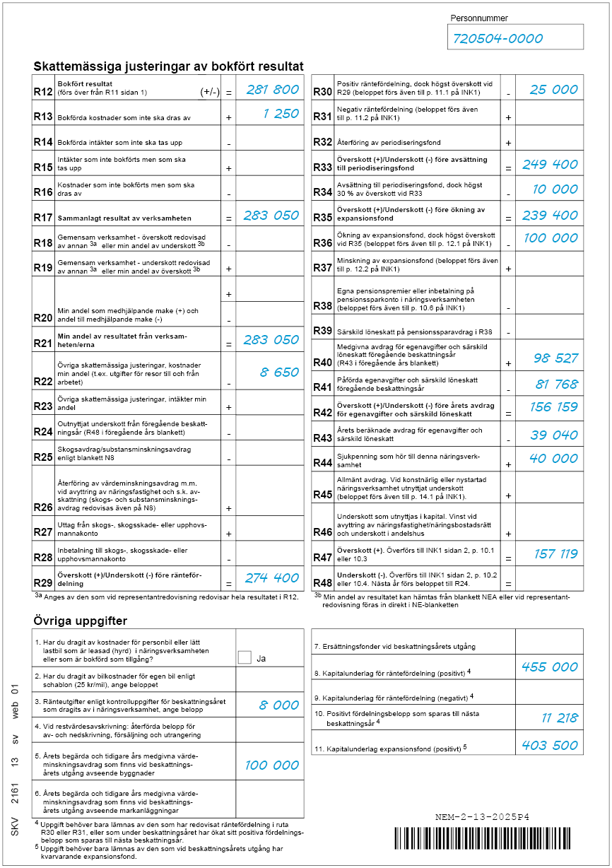 Han har en vinst i R29 och hans kapitalunderlag blir enligt hjälpblanketten SKV 2196, 455 000 kronor. Det innebär att han kan utnyttja ett positivt räntefördelningsbelopp på 39 221 kronor. Håkan väljer att göra avdrag med 25 000 kronor i år och spara resten till kommande år. Han fyller i 25 000 kronor i R30.