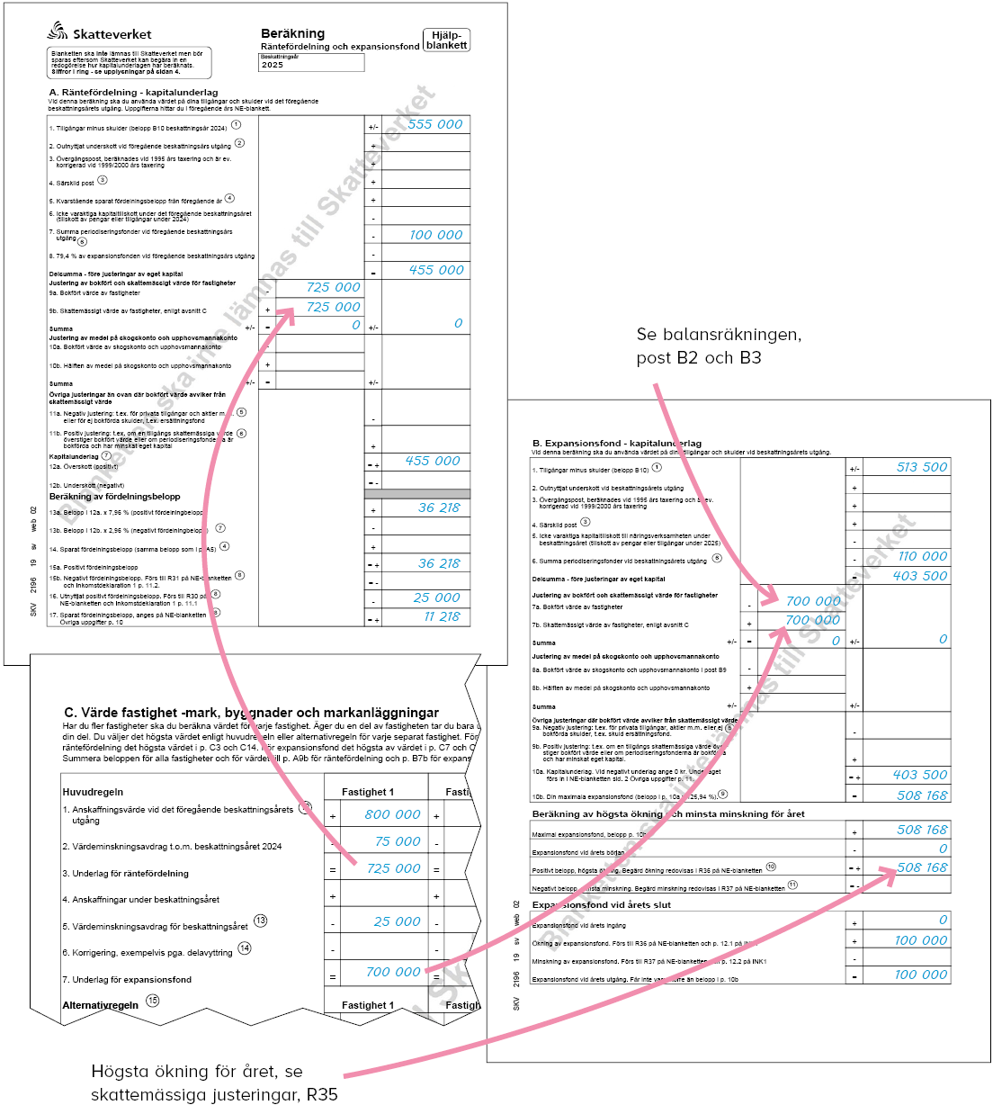 På hjälpblanketten SKV 2196, punkt 12a har han räknat ut att kapitalunderlaget för räntefördelning är 455 000 kronor. Beloppet för han över till punkt 8.