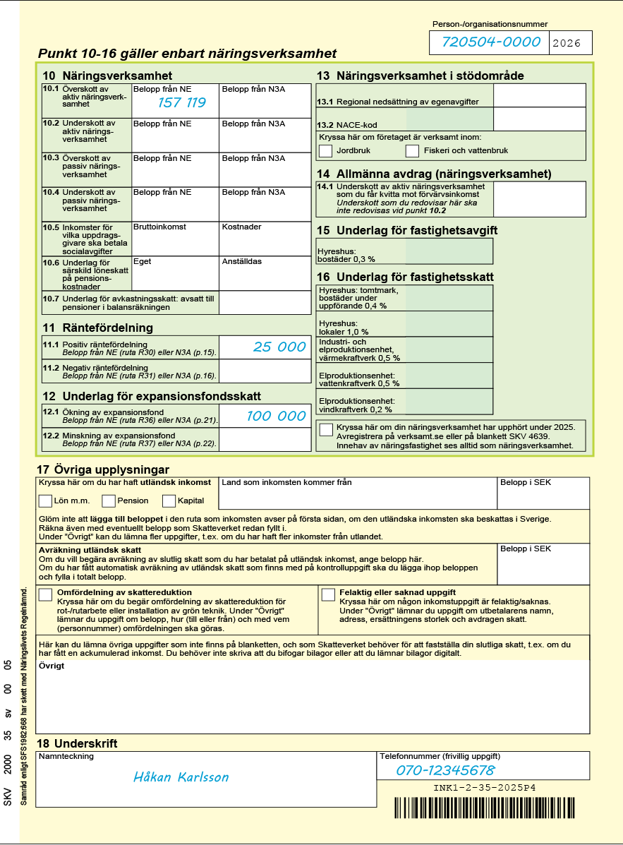 Inkomster efter avdrag för periodiseringsfond är 239 400 kronor. Håkan vill även utnyttja reglerna om expansionsfond. Han beräknar underlaget på hjälpblanketten SKV 2196. Kapitalunderlaget vid expansionsfond är 403 500 kronor vilket innebär att expansionsfonden högst får uppgå till 508 168 kronor, förutsatt att hans överskott är så stort.
