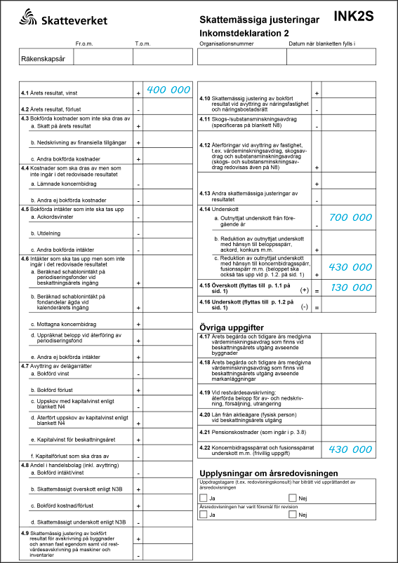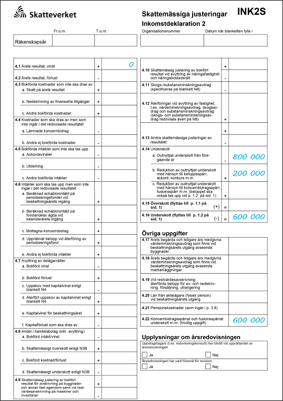 Bolaget kommer därför detta år ha såväl ett överskott på 200 000 kronor att beskatta som ett underskott på 600 000 kronor att rulla vidare (fortfarande spärrat för att utnyttjas mot koncernbidrag från Aktiebolaget A). Bolagets deklaration ska fyllas i på detta sätt år 3.