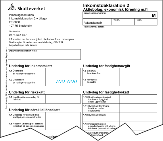 År 2 redovisar bolaget en bokförd förlust på 100 000 kronor. Hela underskottet sedan tidigare (600 000 kronor) får rullas in. Totalt uppgår underskottet nu till 700 000 kronor.