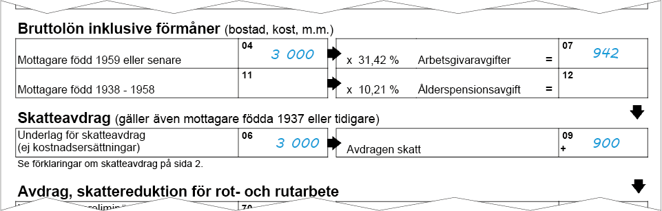 Fyll i summan av beloppen i ruta 07 eller 12 (arbetsgivaravgifter) och ruta 09 (avdragen skatt). Det här beloppet ska huvudmannen betala in till Skatteverket på huvudmannens skattekonto. Ofta hjälper du huvudmannen att göra inbetalningen.