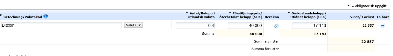 Som beteckning anger Anela Bitcoin. Under Antal/Belopp i utländsk valuta fyller Anela i 0.4. Hon fyller också i försäljningspris (40 000 kronor) och omkostnadsbelopp (17 143 kronor). E-tjänsten räknar då ut hennes vinst automatiskt.