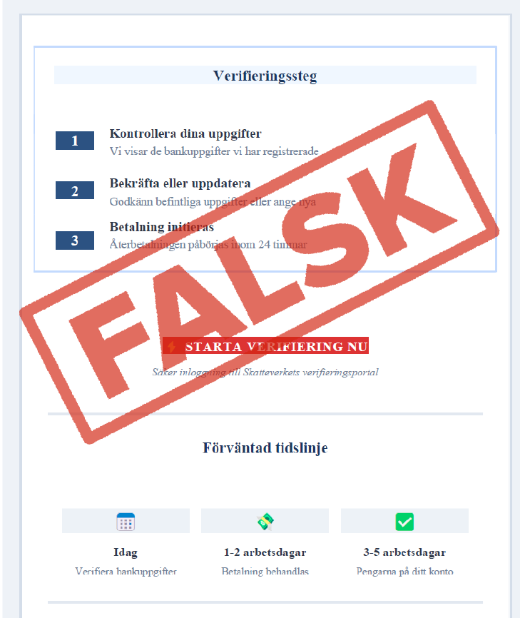 Det händer att bedragare utger sig för att vara Skatteverket och försöker komma åt dina uppgifter genom nätfiske och phishing. Bedragarna använder sig av falska mejl, sms, brev och telefonsamtal i olika varianter. Försök till nätbedrägerier är särskilt vanliga när det är dags att deklarera eller när skatteåterbäringen betalas ut.