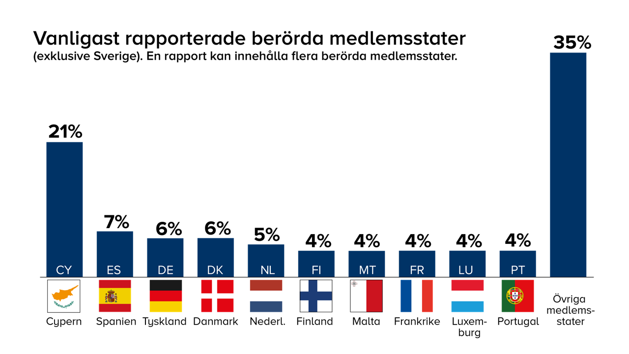 Med undantag för Sverige är den vanligaste förekommande medlemsstat som pekas ut som berörd av det rapporterade arrangemangen Cypern med 21 procent. Därefter följer Spanien med 7 procent, Tyskland och Danmark med 6 procent, Nederländerna med 5 procent. Finland, Frankrike, Luxembourg, Malta och Portugal med 4 procent.