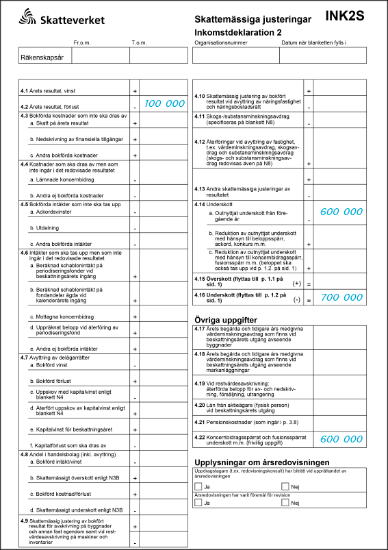Bolaget kommer därför detta år ha såväl ett överskott på 200 000 kronor att beskatta som ett underskott på 600 000 kronor att rulla vidare (fortfarande spärrat för att utnyttjas mot koncernbidrag från Aktiebolaget A). Bolagets deklaration ska fyllas i på detta sätt år 3.