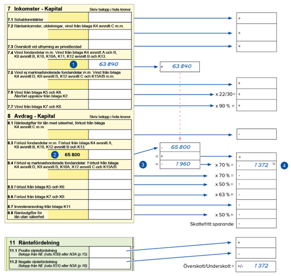 Om du väljer att deklarera på pappersdeklarationen kan du själv räkna ut om du har ett överskott eller underskott av kapital. I exemplet ser du hur inkomster och avdrag kvittas och kvoteras.